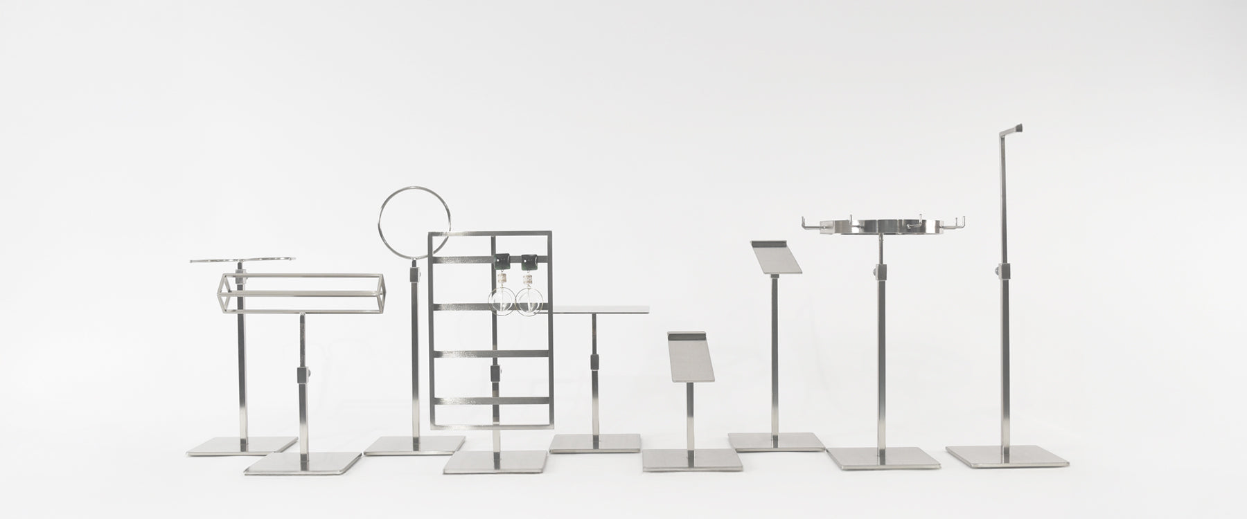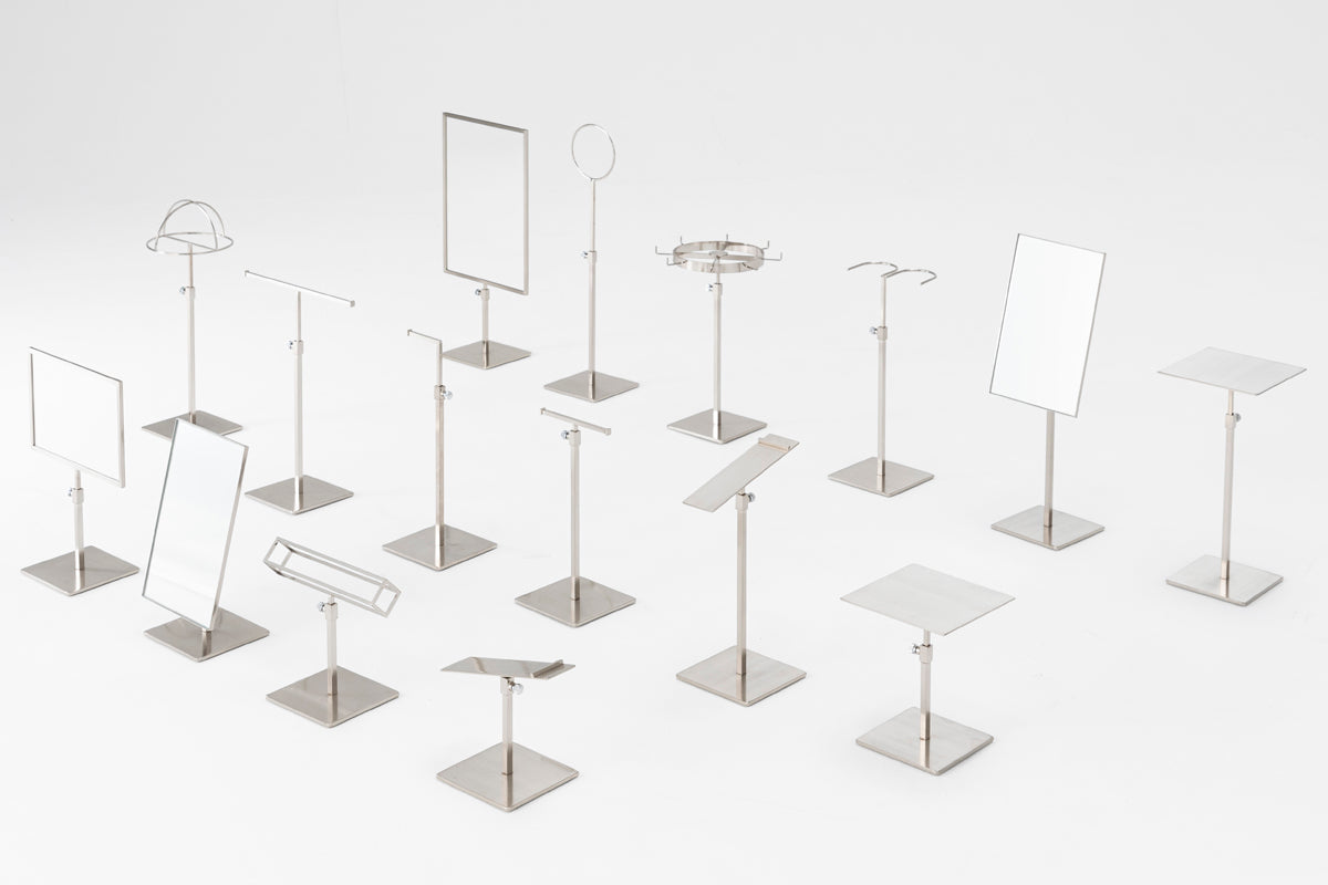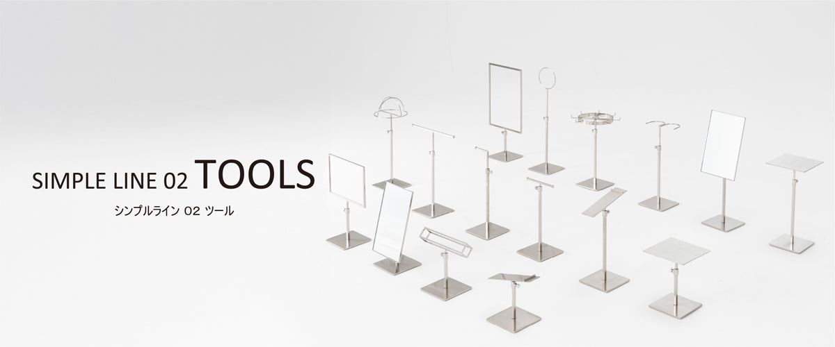 “強度”と“機能性”を両立させた、あらゆるシーンに対応できるツールシリーズ「SIMPLE LINE 02 TOOLS」。 9×9mmの細いスチール素材を使用し、いかに “商品を美しく魅力的に見せるか”を追求し、デザインしました。 小さなアクセサリーから靴・鞄まで対応する全16種のラインナップで、すべての商品が受注生産のため、カラーやベース素材をブランドや使用する空間に合わせてカスタマイズする事も可能です。